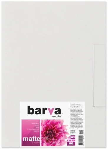 Матовий фотопапір виробництва BARVA. Призначений для друку чорнилами на струменевих принтерах. Характеризується щільністю (125 г/м²). Формат аркушу - A3. Забезпечить відмінну якість друку широкого спектра матеріалів. У комплекті поставляється 60 аркушів.
