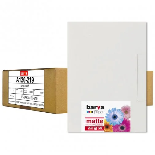 Матовий фотопапір виробництва BARVA. Призначений для друку чорнилами на струменевих принтерах. Характеризується щільністю (120 г/м²). Формат аркушу - A3. Забезпечить відмінну якість друку широкого спектра матеріалів. У комплекті поставляється 1000 аркушів.
