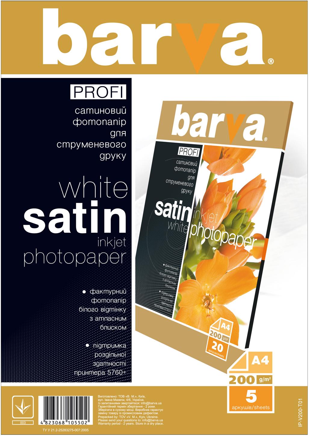 IP-BAR-P-V200-T01 - якісний фотопапір від виробника BARVA. Виготовлений спеціально для творчих людей. Саме використовуючи папір даної компанії ви зможете реалізувати всі свої бажання. Рекомендований для використання професійними фотографами, фотохудожниками, дизайнерами, всім, хто бажає знайти нові способи для втілення ідей і експериментувати.