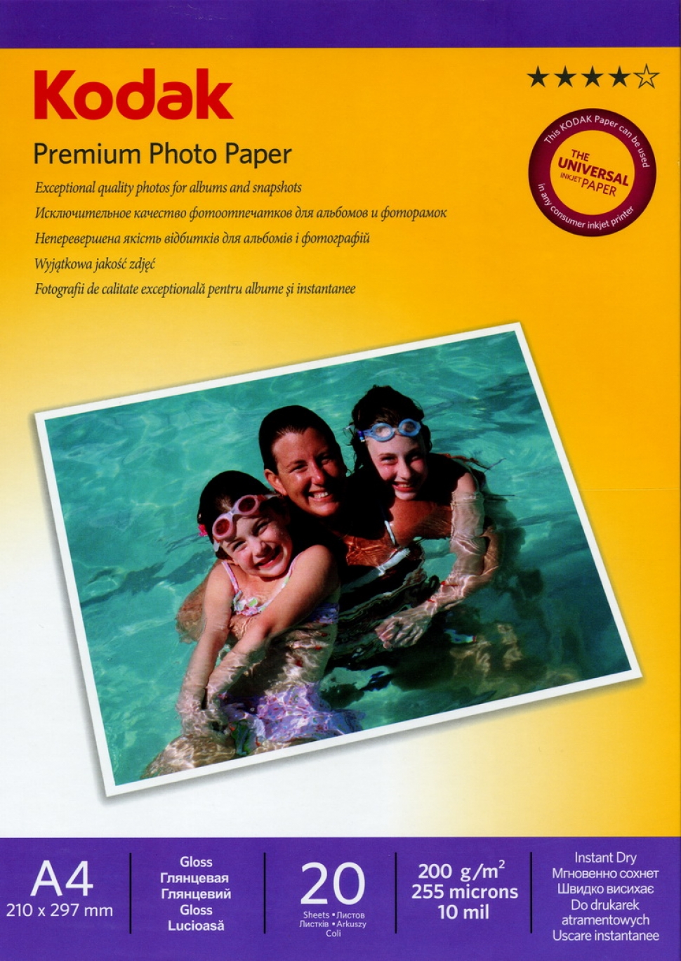 Переваги фотопаперу Kodak для струминного друку - це глянсова вологозахищена поверхня, миттєве вбирання чорнила та те, що він ідеально передає яскраві, насичені кольори з безліччю відтінків.