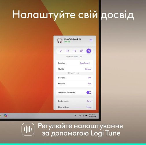 Звук у Zone Wireless 2 вражає завдяки великим 40-міліметровим динамікам, які забезпечують потужний бас і чітке відтворення як музики, так і голосу співрозмовників. Технологія динамічного еквалайзера та персоналізований EQ через додаток Logi Tune дозволяють налаштувати аудіо під індивідуальні вподобання та навіть особливості слуху користувача.