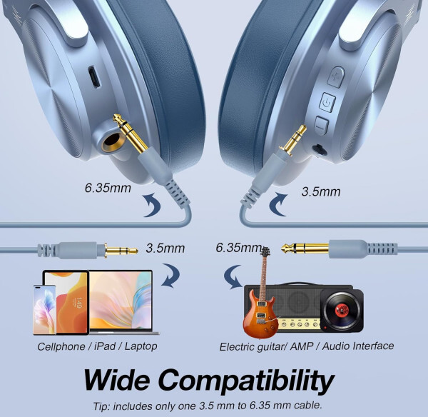 Навушники OneOdio Fusion A70 — це універсальна модель, яка поєднує дротове та бездротове підключення, завдяки чому підходять як для щоденного прослуховування музики, так і для професійних завдань. Вони оснащені Bluetooth 5.2 для стабільного бездротового з’єднання та підтримують до 72 годин безперервного відтворення на одному заряді акумулятора. Водночас у дротовому режимі через комплектні кабелі 3.5 мм та 6.35 мм навушники працюють без обмежень заряду, що робить їх надійним вибором для студійної роботи, моніторингу, мікшування чи навіть DJ-використання.