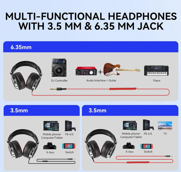 Підключення гнучке завдяки знімному пружинному кабелю: один з прямим 6.35 мм і 3.5 мм штекерами, інший з мікрофоном і 3.5 мм штекером. Це дозволяє одночасно підключати два пристрої та ділитися музикою через daisy-chain, а також відповідати на дзвінки. Комплектація включає обидва кабелі, адаптер і все необхідне для негайного використання.