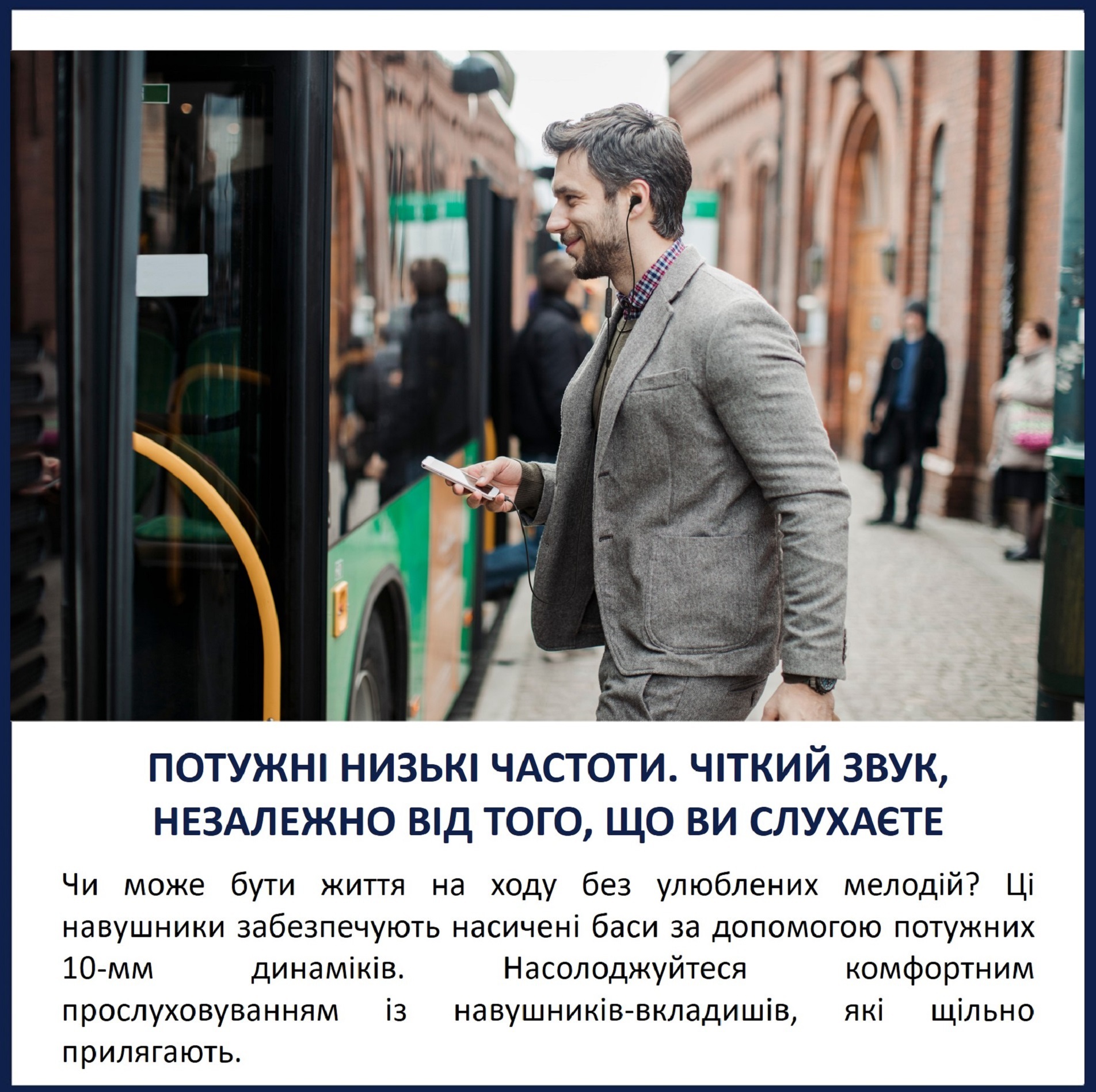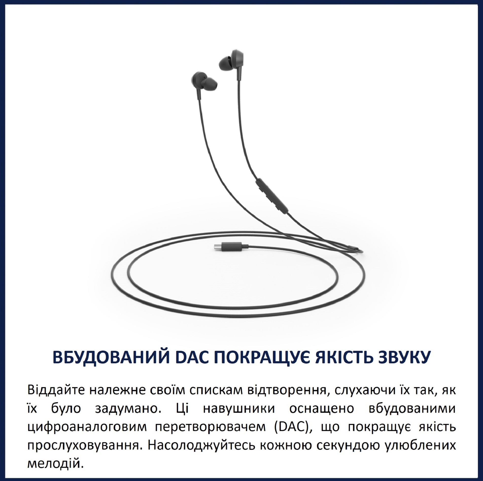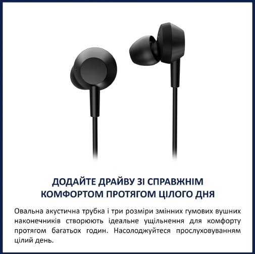 Комфорт — одна з головних переваг цих навушників. Легка конструкція та овальна акустична трубка з трьома розмірами м'яких силіконових наконечників створюють надійне ущільнення у вусі. Вони надійно тримаються навіть під час активного руху, дозволяючи слухати музику чи подкасти цілий день без втоми.