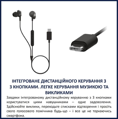 Інтегроване дистанційне керування з трьома кнопками робить використання максимально зручним: регулюйте гучність, ставте на паузу, перемикайте треки, відповідайте на дзвінки чи викликайте голосового помічника — усе без потреби діставати телефон. Вбудований мікрофон забезпечує швидке перемикання між музикою та розмовами, а ваш голос звучить чітко під час викликів.
