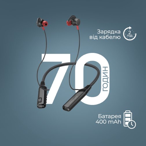 Заряду вистачить на 70 годин відтворення у режимі non-stop і 150 днів у режимі очікування. Зарядити навушники можна комплектним кабелем за 2 години, а рівень заряду покаже LCD екран.