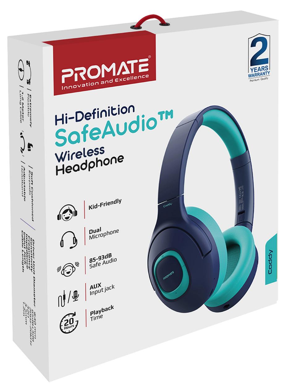 Promate Coddy — Kid-Friendly бездротові навушники з обмежувачем гучності та двома мікрофонами. Крім прямого призначення, ідеально підходять для онлайн-занять під час карантинних обмежень.