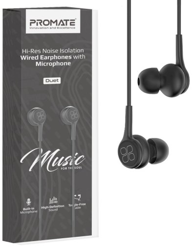 Duet — стильні вакуумні навушники від Promate. 10 мм динаміки, пасивне шумозаглушення та лаконічний дизайн з матовим покриттям поєднані для найкращого звучання.
