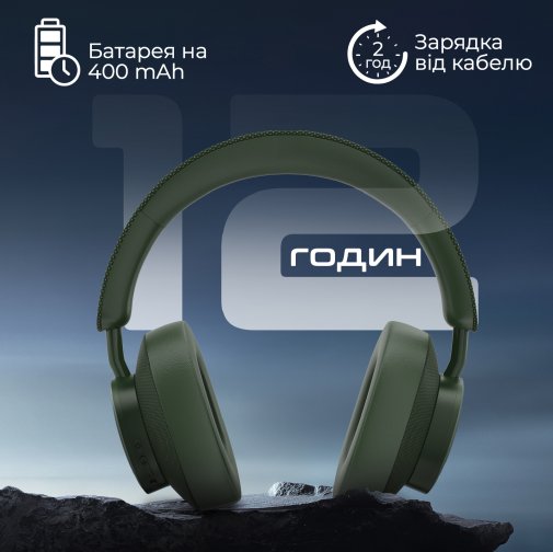 Вистачить на 12 годин відтворення в режимі non-stop і 180 годин у режимі очікування. Зарядити навушники можна комплектним кабелем за 2 години.