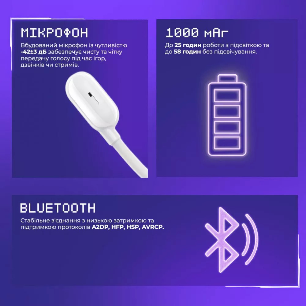 Акустичну основу гарнітури формують 40-мм динамічні випромінювачі з чутливістю 112±3 дБ і охопленням усього частотного діапазону від 20 Гц до 20 кГц. Опір 32 Ом забезпечує стабільний і точний звук — насичений бас, деталізовані середини та чіткі верхні частоти розкривають кожен звуковий нюанс гри. Підтримуються аудіодекодери SBC та AAC, а протоколи A2DP, HFP, HSP та AVRCP гарантують широку сумісність з усіма актуальними платформами та пристроями. Фішкою моделі є режим 7.1 об'ємного звуку — він створює просторову аудіокартину, що дозволяє безпомилково визначати напрямок звуку в грі: звідки чутно кроки, де ведеться стрільба і з якого боку наближається противник.