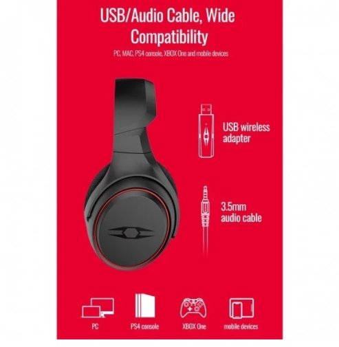 Навушники працюють бездротово через USB-адаптер у мережі Wi-Fi 2.4 ГГц — підключення відбувається за принципом Plug and Play, без жодних додаткових налаштувань. Фізичні кнопки на чашах дозволяють керувати відтворенням, регулювати гучність і вмикати багатоканальний звук — функцію, яка особливо корисна в іграх для точного визначення напрямку звуку. Передбачено і від'єднуваний кабель у тканинному обплетенні з 3.5-мм джеком і замком від випадкового від'єднання — для підключення до консолей або телефону.