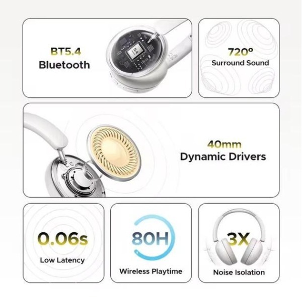 Насолоджуйтеся насиченим, захопливим звуком завдяки 40-мм динамічним драйверам останнього покоління, що забезпечують точну деталізацію, глибокі баси та широку звукову сцену — ідеально для музики, фільмів, ігор чи подкастів. Технологія Bluetooth 5.4 гарантує вищу швидкість з'єднання, мінімальну затримку та стабільність навіть на відстані до 10 м, з підтримкою мультипоінт-підключення — одночасно з’єднуйтесь з двома пристроями (смартфон + ноутбук) і легко перемикайтесь між ними без перез’єднання.