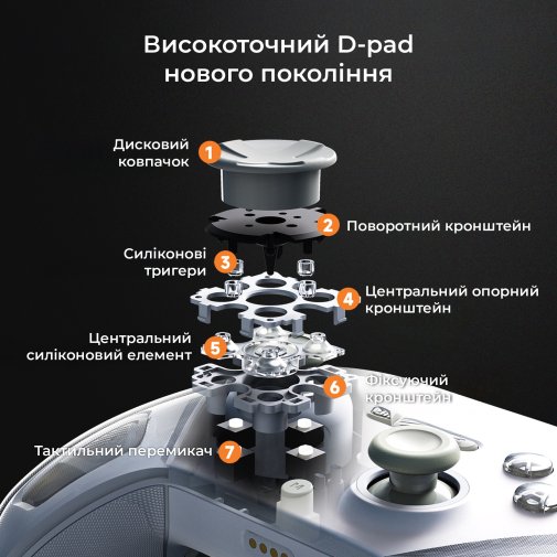Геймпад оснащений високоточними Hall-джойстиками та тригерами, механічними кнопками з тривалим ресурсом роботи, подвійними моторами вібрації та RGB-підсвіткою. Це дозволяє отримувати комфортне й чітке відчуття керування у різних жанрах ігор. Крім того, є дві програмовані кнопки M1/M2 для макросів і швидких дій у грі.