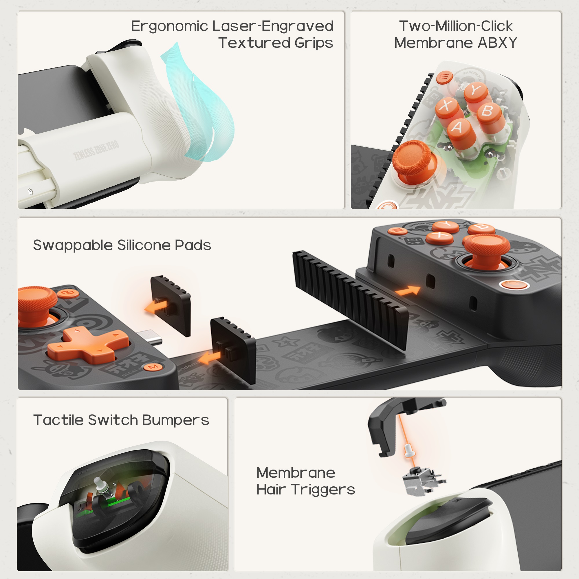 Функція Turbo доступна для кнопок A, B, X, Y, LB, RB, LT та RT і дозволяє автоматизувати повторювані натискання для швидшої та ефективнішої гри. Наскрізне заряджання (pass-through charging) дає змогу підключати зовнішнє живлення до геймпада і заряджати телефон прямо під час гри — без перерв і без ризику розрядити пристрій. Через застосунок GameSir можна перепризначати кнопки, змінювати розкладку між Xbox і Switch, а також налаштовувати інші параметри під конкретні ігри. Частину налаштувань можна застосовувати безпосередньо під час гри за допомогою комбінацій кнопок.