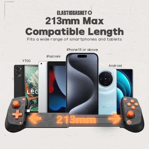 X5 Lite підтримує пристрої довжиною від 105 до 213 мм, що охоплює переважну більшість сучасних смартфонів. Рухомий роз'єм Type-C надійно фіксує телефон і забезпечує стабільне з'єднання з мінімальною затримкою. Геймпад живиться безпосередньо від телефону й не потребує власного акумулятора, що спрощує використання і зменшує загальну вагу пристрою.
