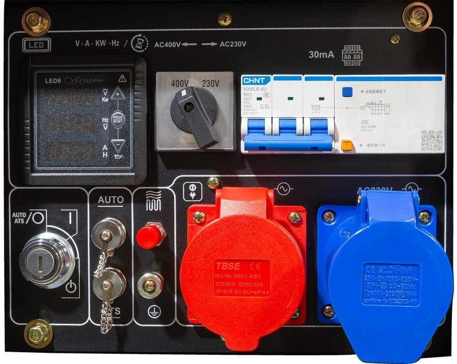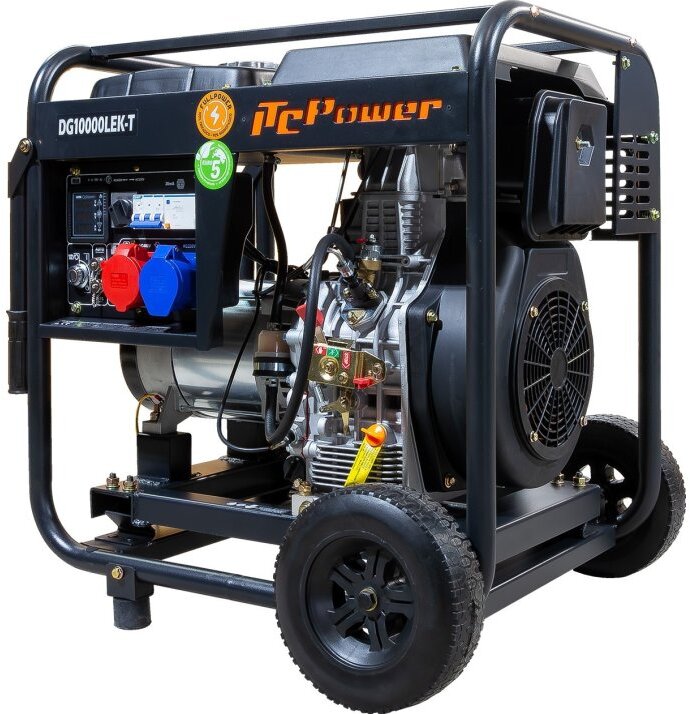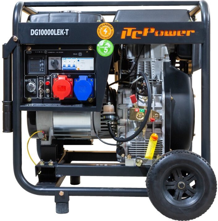 Трифазний дизельний генератор ITC Power DG10000LEK-T є надійним джерелом резервного та автономного живлення для невеликих об’єктів, де потрібна стабільна робота як при 400 В, так і при 230 В. Оснащений одноциліндровим двигуном DIESEL D680E об’ємом 678 см³ та потужністю 14,4 к. с., він забезпечує максимальну вихідну потужність 10 кВА (при трифазному підключенні 400 В) або близько 7,2 кВт в однофазному режимі 230 В. Завдяки вбудованому AVR-регулятору напруги генератор видає стабільний струм, а номінальні розетки дозволяють підключати навантаження 16 А та 32 А, а також витримувати постійний струм до 31 А.