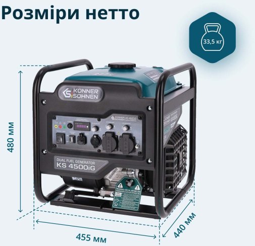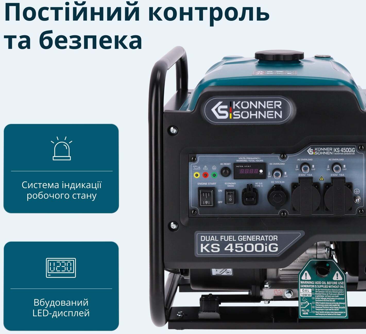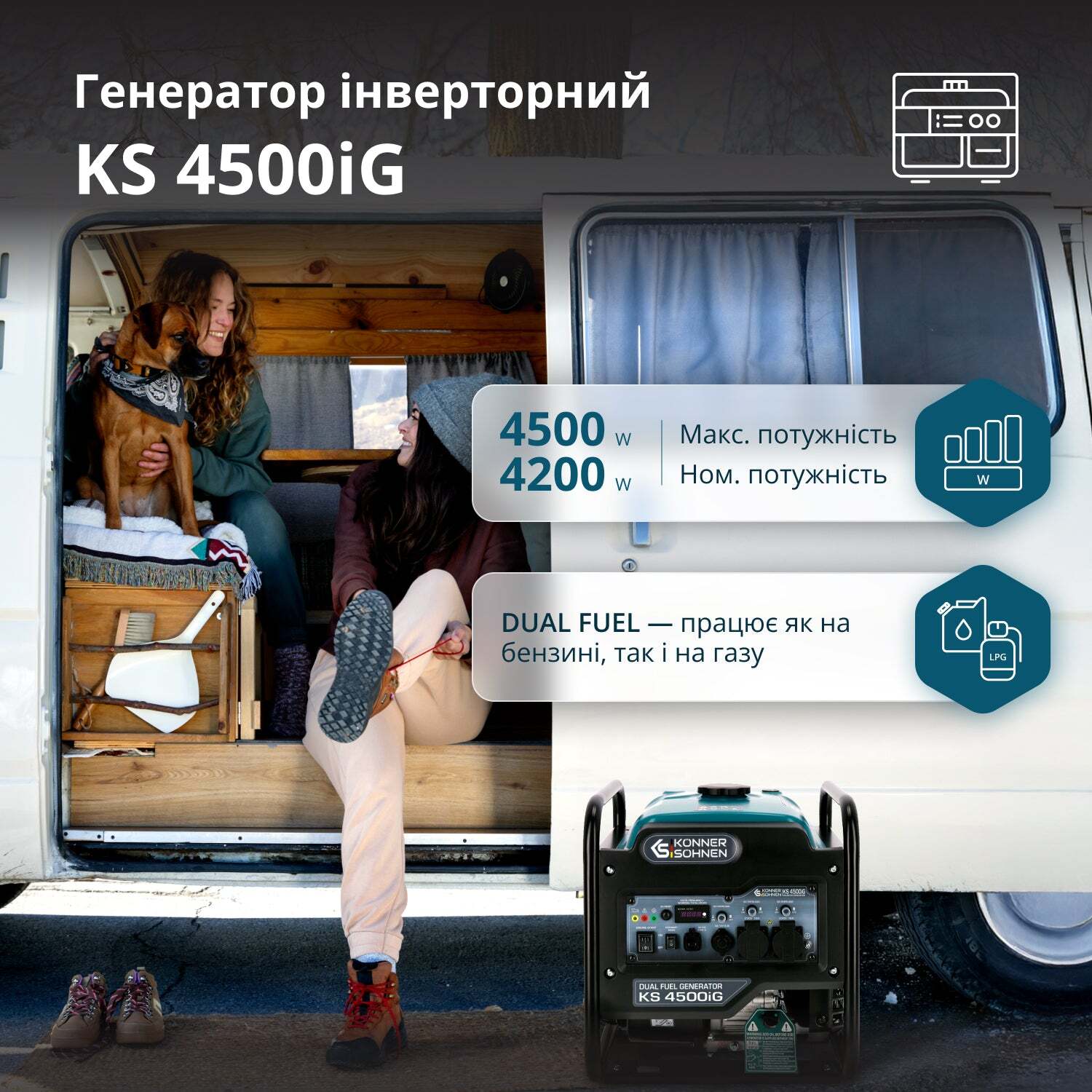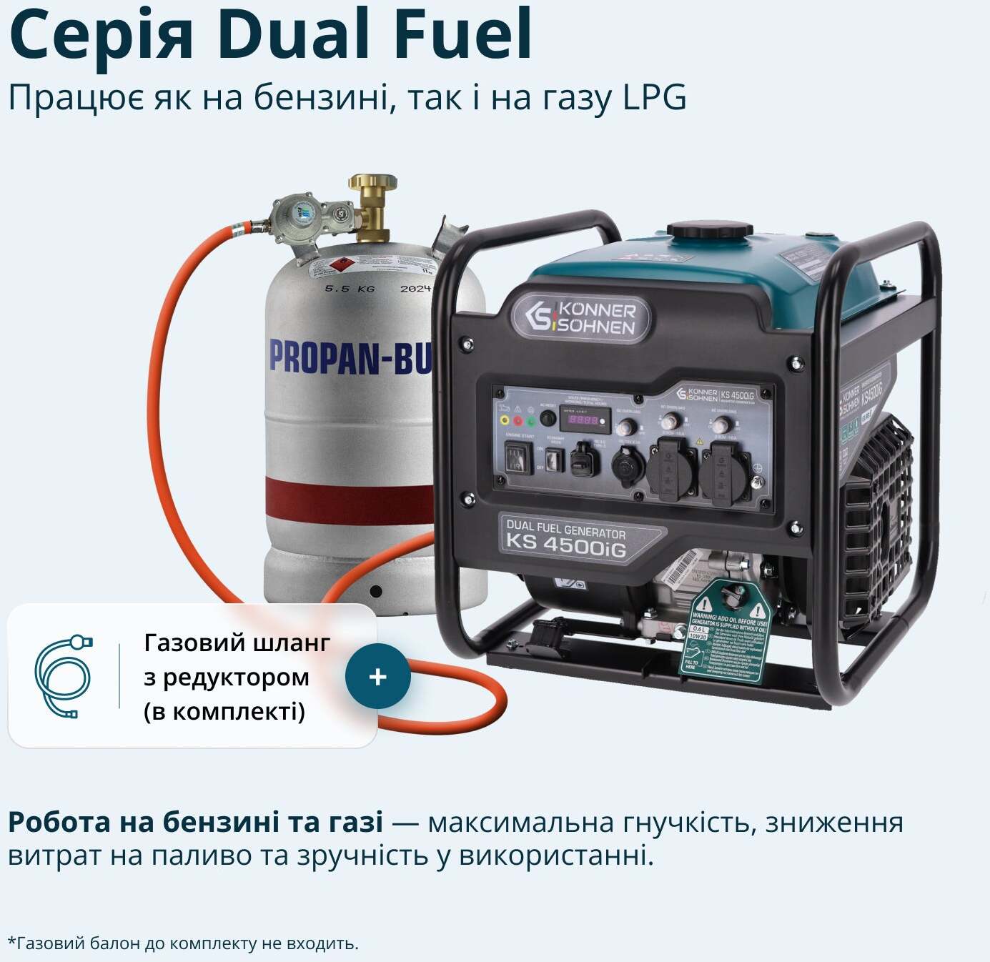 Двопаливний інверторний генератор KS 4500iG (4,2 кВт на бензині, 3,8 кВт на газі) забезпечує стабільне електроживлення для медичного обладнання, лабораторних приладів, серверів, систем збереження даних та ін. Інверторна технологія гарантує чисту синусоїду — безпечно для чутливої електроніки. Працює на бензині й газі (LPG), знижуючи витрати й викиди.