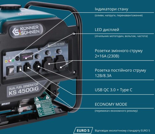 Оснащений надійним двигуном K&S (EURO V), LED-дисплеєм, розетками 16А, 12В, USB QC 3.0, Type-C. Має економний режим, компактний та зручний у транспортуванні — ідеальний для кемпінгу, риболовлі, походів та резервного живлення в екстрених ситуаціях.
