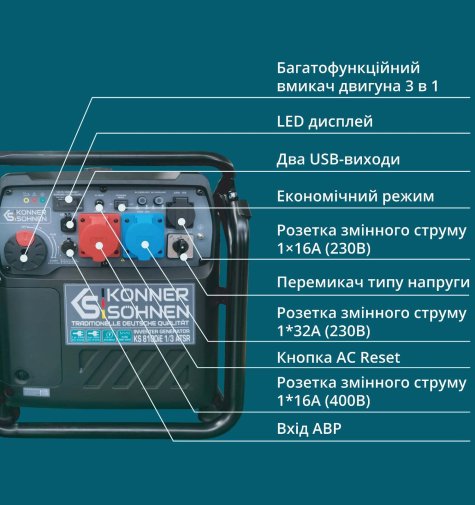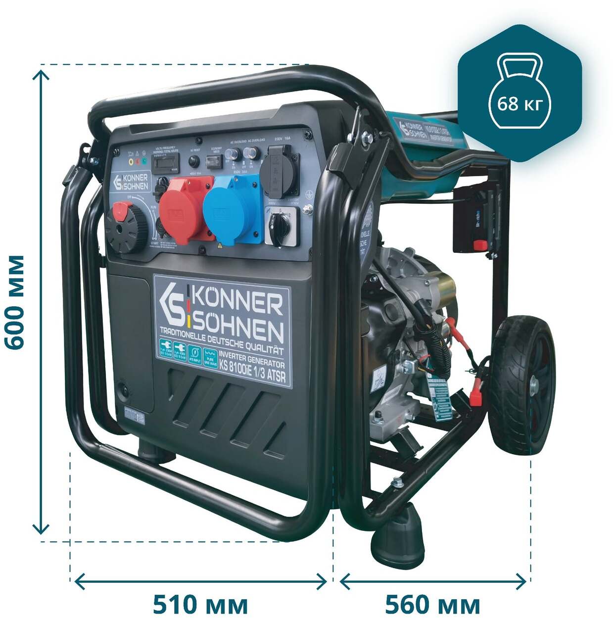 Інверторний генератор KS 8100iE 1/3 ATSR від Könner & Söhnen — потужне та надійне джерело електроенергії з системою VTS, що дозволяє працювати в одно- та трифазному режимах без втрати потужності. Оснащений двигуном K&S стандарту EURO V, економічним режимом, підтримкою АВР, системою запуску 3-в-1. LED-дисплей, USB-виходи, з розетками 1×16A (230B),1×32A (230B),1×32A (230B), альтернатор з мідною обмоткою та комплект для транспортування забезпечують комфорт та довговічність. Підходить для живлення чутливої електроніки, такої як медичне обладнання, аудіо- та відеотехніка, стабільно працює навіть при високих навантаженнях.