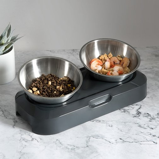Набір включає дві чаші (для води та корму), пропонуючи комплексне та зручне рішення для щоденного годування в одному стильному місці.