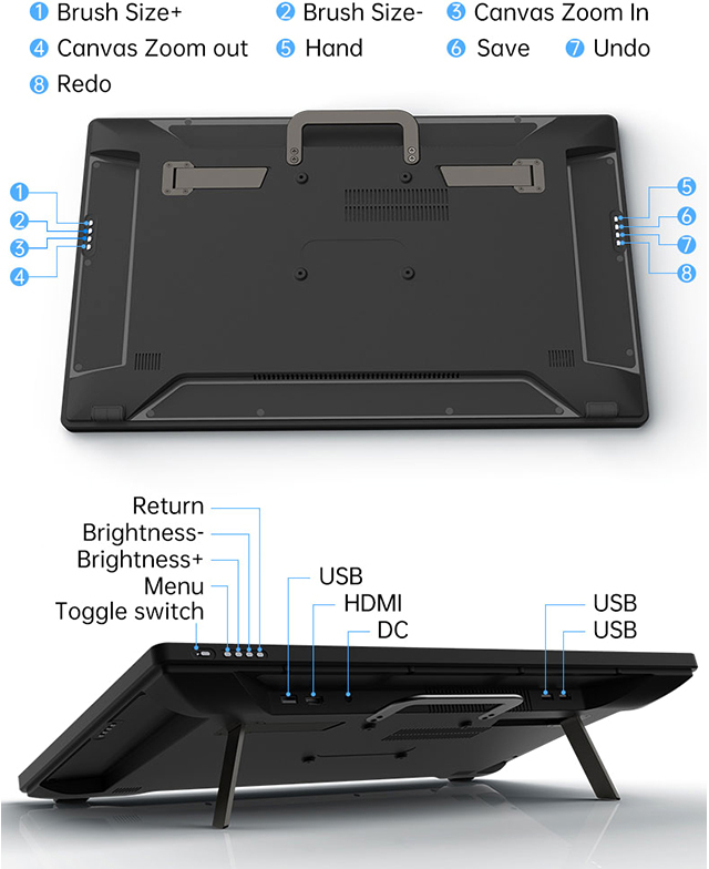 Монітор живиться від адаптера 12 В 2 А, має сучасні інтерфейси HDMI та Type-C, а його габарити становлять 531×323×40 мм при вазі 5 кг. Компактний, але функціональний — чудовий вибір для дизайнерів, ілюстраторів та всіх, хто шукає якісний дисплей 2-в-1.
