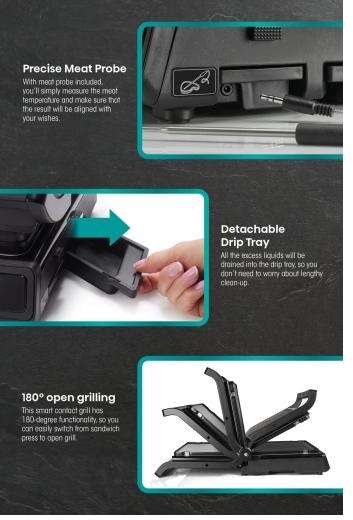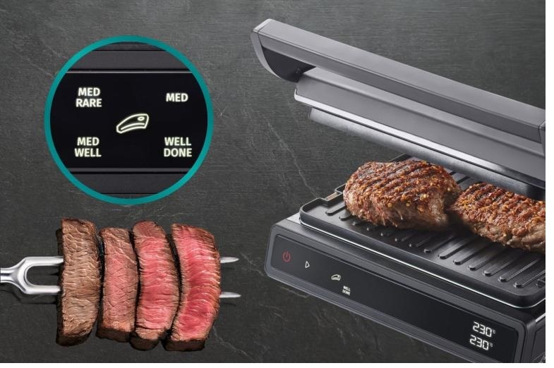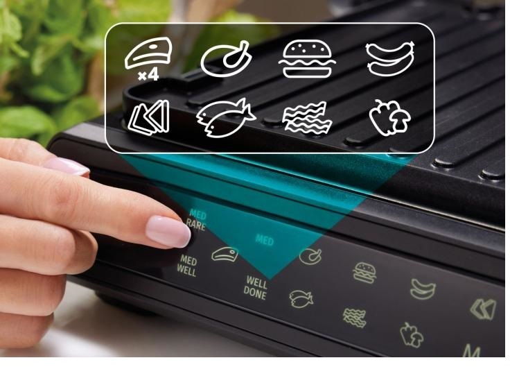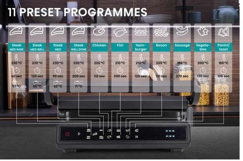 Для ще більшої зручності гриль оснащений 11 попередньо встановленими програмами, включно з беконом, сендвічами, куркою, рибою, овочами, гамбургерами, ковбасами, а також різними ступенями просмаження стейка. Для досвідчених користувачів передбачена ручна настройка температури, яка дає можливість повного контролю над процесом приготування.