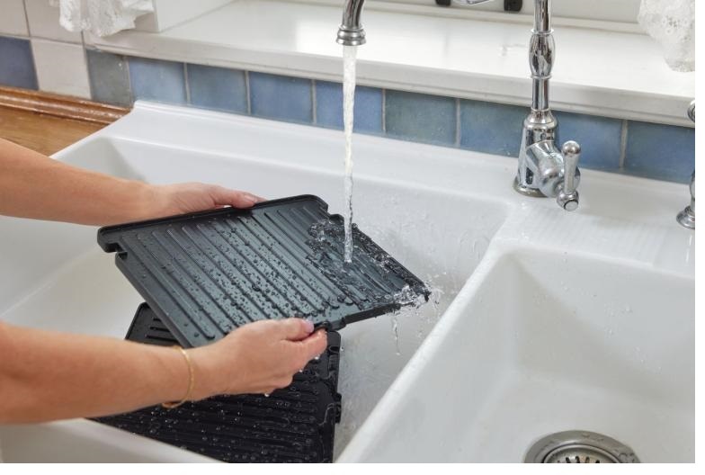 Гриль обладнаний знімними двосторонніми панелями: профільованою для сосисок, риби, овочів та паніні, та гладкою для стейків, бургерів, яєчні або омлету. Панелі можна легко мити в посудомийній машині. Для збору зайвої рідини передбачений піддон, розташований збоку, що спрощує очищення та підтримку порядку.
