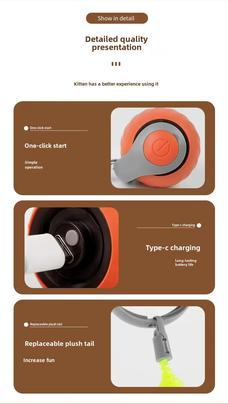Хвіст із м’якого штучного матеріалу створює ефект «здобичі», привертаючи увагу й мотивуючи до активної гри. Іграшка рухається хаотично, додаючи елемент несподіванки.