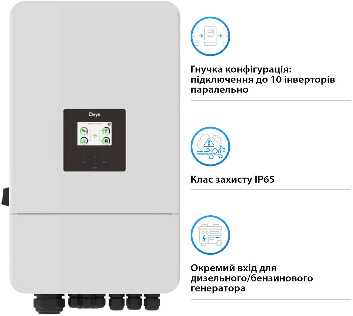 Інвертор має компактний корпус з IP65-захистом від пилу та вологи, що легко встановлюється на стіну чи підлогу, з трифазним виходом 12 кВт (пікова потужність 13.2 кВт) для запуску потужних пристроїв, як кондиціонери чи насоси, з підтримкою нерівномірного навантаження по фазах для гнучкого розподілу енергії в домі чи офісі. Інвертор сумісний з літієвими акумуляторами 48 В, з максимальним струмом заряду/розряду 240 А, дозволяючи зберігати надлишок сонячної енергії для ночі чи відключень, з режимами zero-export для обмеження викиду в мережу чи повної автономії, ніби розумний менеджер, що балансує між сонцем, батареями та побутовими потребами.