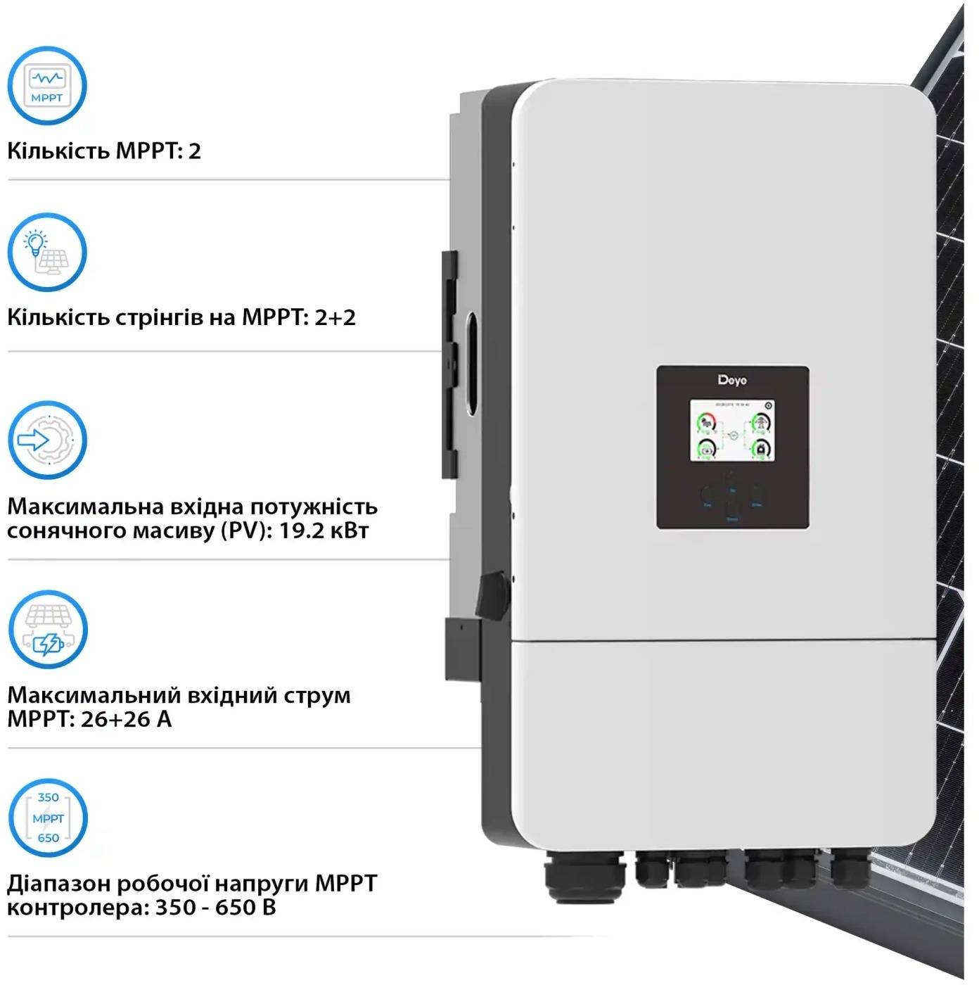 Ця модель оснащена двома MPPT-трекерами для максимального використання сонячних панелей з вхідною потужністю до 19.2 кВт, з широким діапазоном напруги 200-650 В, що дозволяє оптимізувати виробництво енергії навіть у похмуру погоду, з ефективністю 99%, роблячи кожну панель джерелом максимальної віддачі.