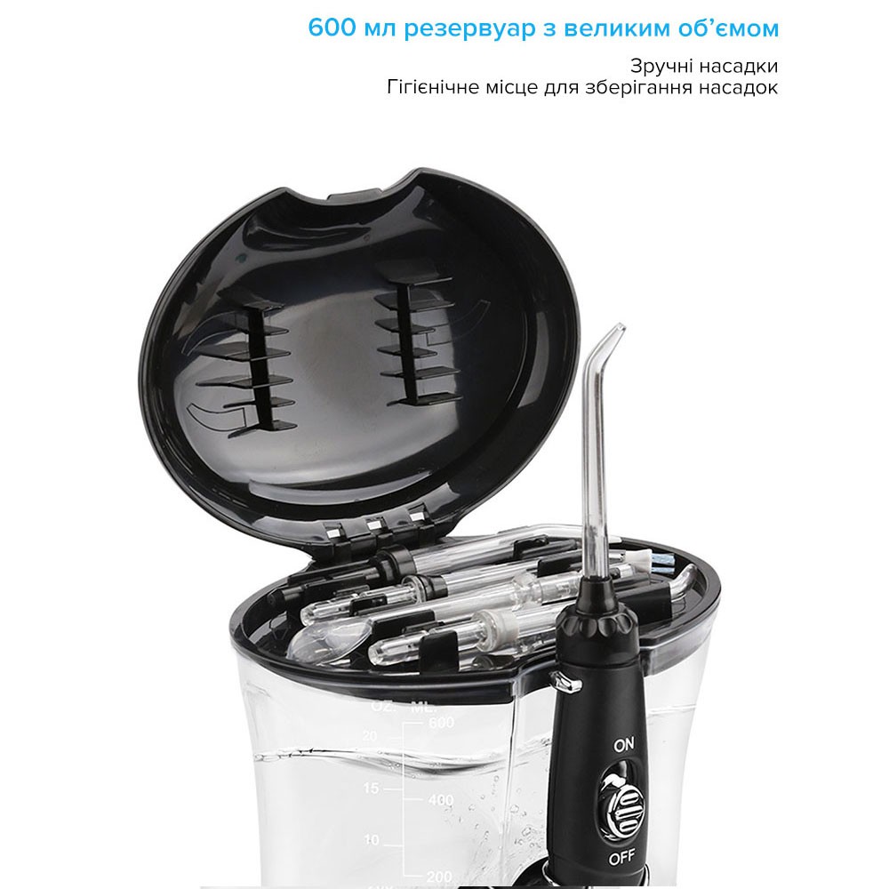 Цей стаціонарний пристрій з великим резервуаром для води об'ємом 600 мл дозволяє проводити глибоке очищення зубів, ясен і міжзубних просторів, видаляючи наліт, харчові залишки та бактерії. Завдяки регульованому тиску води від 30 до 125 PSI ви можете налаштувати інтенсивність процедури під ваші потреби, роблячи процес комфортним навіть для чутливих ясен.