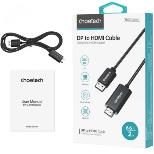 Choetech XDH01 — це кабель-адаптер із роз'ємом DisplayPort на вході та HDMI на виході, який дозволяє підключити комп'ютер або ноутбук із портом DisplayPort до монітора, телевізора чи проєктора з HDMI-входом. Це просте та надійне рішення для розширення робочого простору або виведення зображення на великий екран без необхідності використання окремих перехідників.