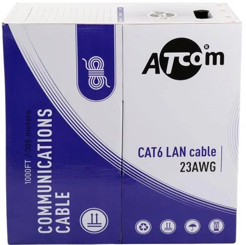 Кабель LAN виробництва ATcom. Належить до категорії 6E, призначений для внутрішніх робіт. Довжина кабелю складає 305 м.