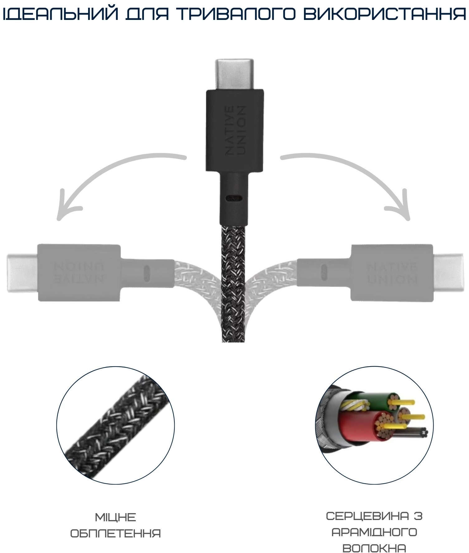 Особливістю цього кабелю є його надзвичайна міцність і продуманий дизайн. Посилена конструкція з арамідною (кевларовою) серцевиною, тканинним обплетенням із 100% переробленого ПЕТ та екологічними матеріалами робить його стійким до численних вигинів, ударів і щоденного інтенсивного використання. Інноваційний ремінець із переробленої шкіри дозволяє акуратно згорнути кабель і запобігти заплутуванню, що робить його ідеальним компаньйоном для подорожей, офісу чи дому. Легка вага в 40 грамів додає зручності, не обтяжуючи сумку чи кишеню.