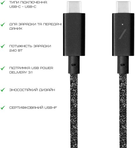 Кабель Native Union Belt Pro 240W — це справжній преміальний аксесуар для сучасних гаджетів. Завдяки підтримці потужності до 240 Вт за стандартом Power Delivery 3.1 він забезпечує блискавичну зарядку навіть для найбільш енергоємних пристроїв, таких як потужні ноутбуки, монітори чи професійні робочі станції. Довжина 2,4 метра дає свободу рухів, дозволяючи комфортно працювати чи відпочивати, не прив’язуючись близько до розетки, а сертифікація USB-IF гарантує повну сумісність і безпеку використання.