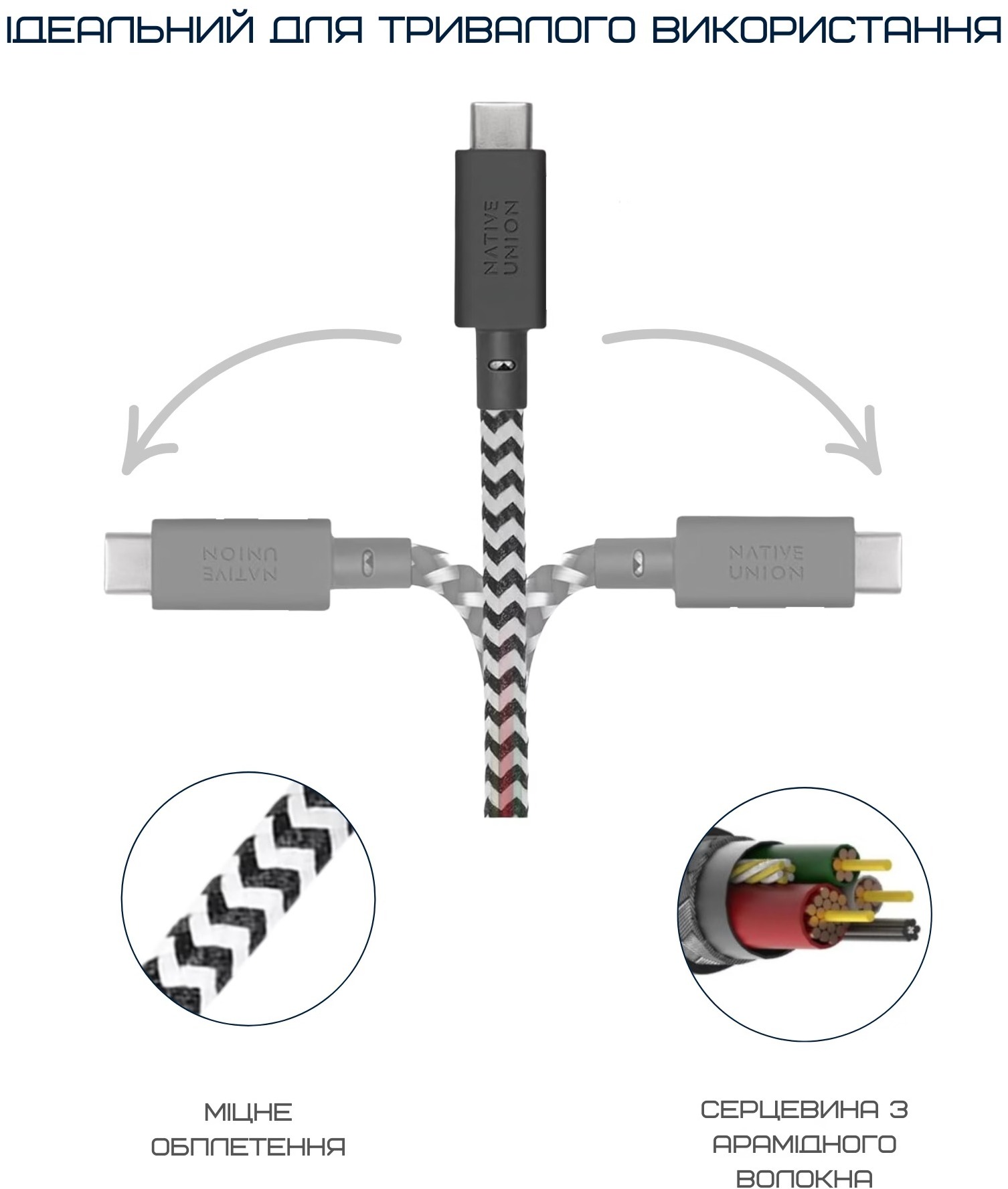 Особливістю цього кабелю є його надзвичайна міцність і продуманий дизайн. Посилена конструкція з арамідною (кевларовою) серцевиною, тканинним обплетенням із 100% переробленого ПЕТ та екологічними матеріалами робить його стійким до численних вигинів, ударів і щоденного інтенсивного використання. Інноваційний ремінець із переробленої шкіри дозволяє акуратно згорнути кабель і запобігти заплутуванню, що робить його ідеальним компаньйоном для подорожей, офісу чи дому. Легка вага в 40 грамів додає зручності, не обтяжуючи сумку чи кишеню.