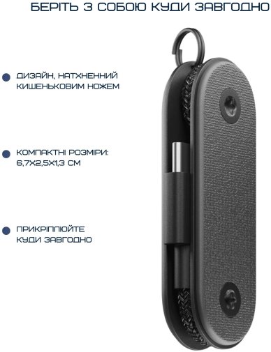 Цей ультракомпактний кабель оснащений вбудованим карабіном, завдяки якому його легко прикріпити до ключів, рюкзака чи сумки. Він миттєво розкладається для використання, а після — акуратно складається в прихований органайзер для кабелю, що повністю виключає заплутування. Така портативність робить його незамінним у подорожах, на прогулянках чи в офісі — ви просто берете один кабель і забуваєте про зайвий мотлох.