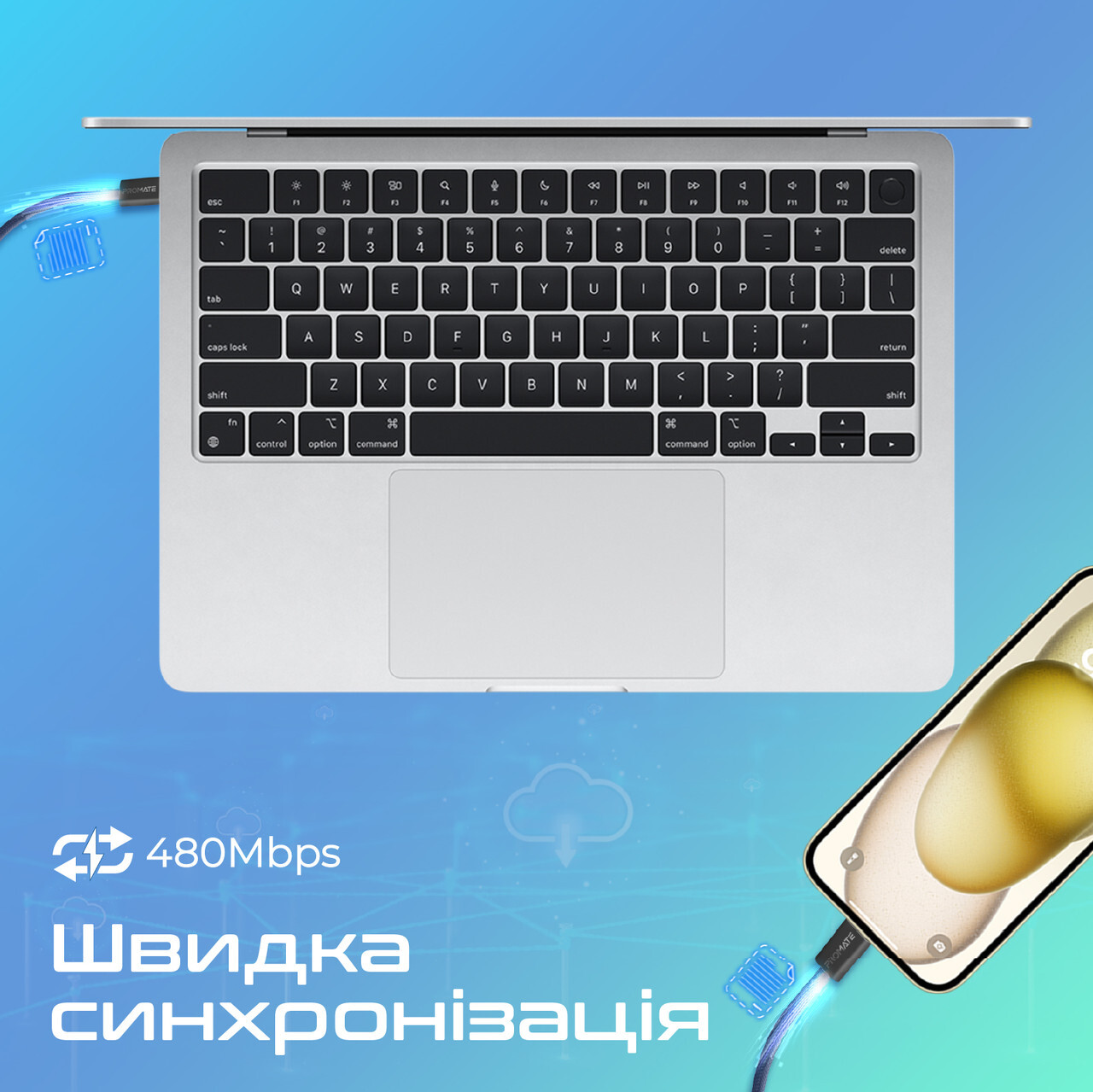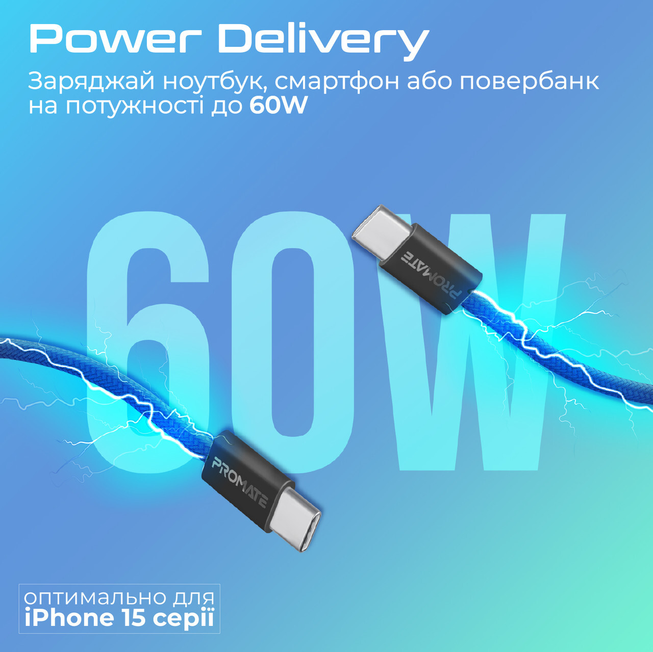 - Power Delivery: Заряджай ноутбук, смартфон або павербанк на потужності до 60W (20V/3А).