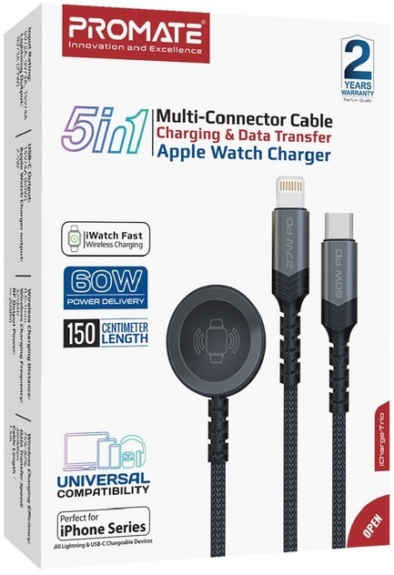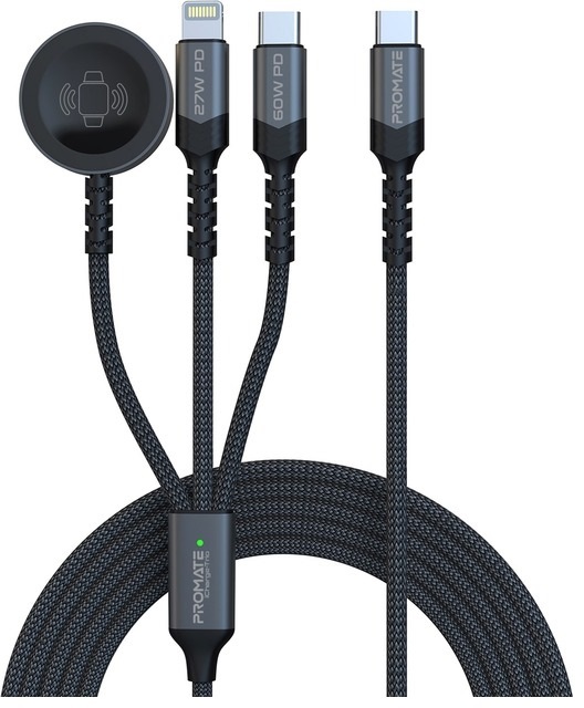 Promate iCharge-Trio - багатофункціональний зарядний кабель. USB-C з підтримкою Power Delivery, 27 Вт Lightning конектор, та бездротова зарядка для Apple Watch.