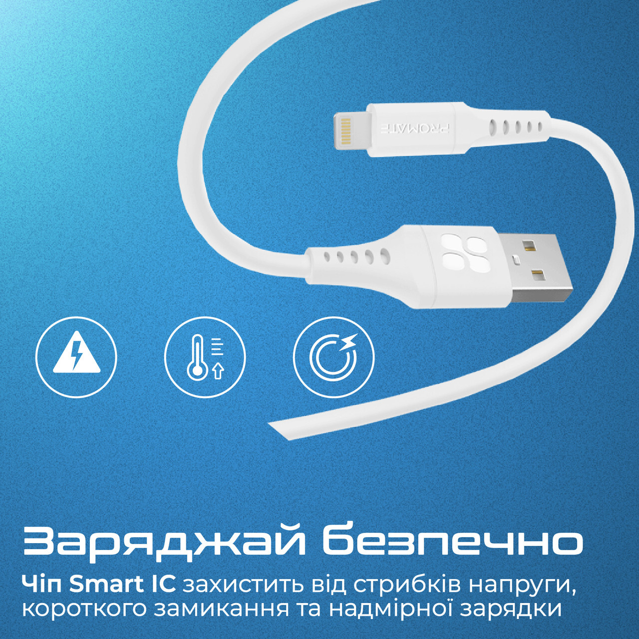 Надійний і приємний на дотик кабель із м'якого силікону, що не заплутується. Promate PowerLink-Ai120 — найкраще рішення для заряджання та синхронізації техніки Apple від класичного USB порту.