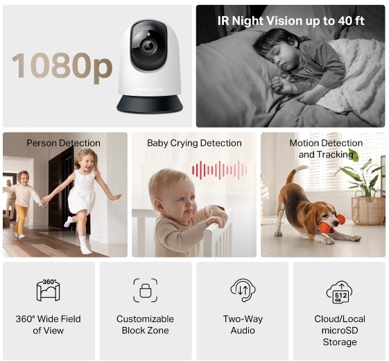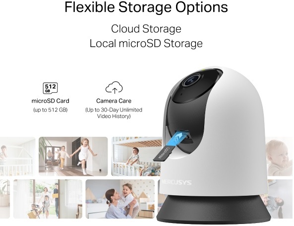 Широкий кут огляду дає змогу охопити всю кімнату з однієї точки, а моторизований механізм плавно й безшумно повертає камеру за командою зі смартфона. Вбудований датчик руху миттєво надсилає сповіщення в застосунку Mercusys, а функція автоматичного стеження сама супроводжує об’єкт у кадрі.