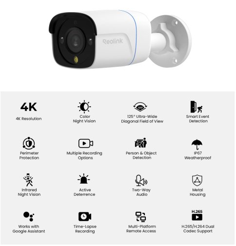Запис відео ведеться на карту пам’яті microSD безпосередньо в камері, а також підтримується робота з Reolink NVR. Підключення по PoE через RJ-45 значно спрощує монтаж — один кабель передає і живлення, і дані. Міцний металевий корпус з рівнем захисту IP67 надійно захищає пристрій від пилу та води, а широкий діапазон робочих температур від -30 °C до +55 °C забезпечує стабільну роботу в будь-яких погодних умовах.