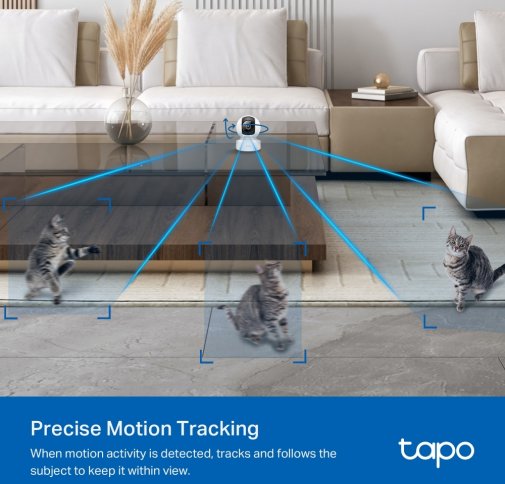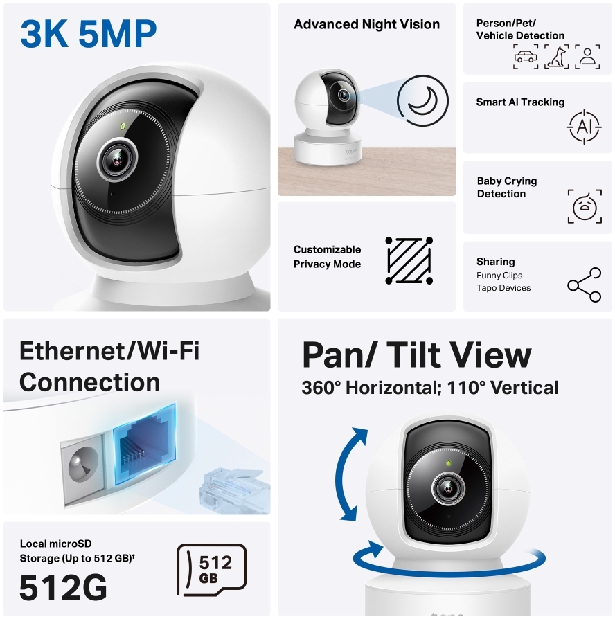 Двосторонній аудіозв'язок з шумозаглушенням і сирена на 99 дБ з освітленням відлякують непроханих гостей, а функція автоматичного відстеження тримає об'єкт у кадрі, додаючи зручності для спілкування з близькими чи контролю за вихованцями. Зберігання на microSD до 512 ГБ або в хмарі Tapo Care з шифруванням AES 128-біт захищає записи, а підтримка Wi-Fi 2.4 ГГц, Ethernet, RTSP, ONVIF та голосового керування через Google Assistant чи Amazon Alexa інтегрує камеру в розумний дім.