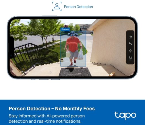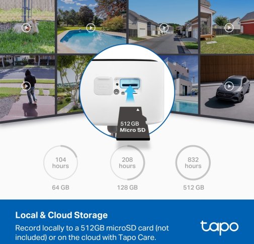 PIR-датчик руху з кутом 110° і ШІ-розпізнаванням людей без передплати мінімізує помилкові сповіщення, фокусуючись на реальних подіях у налаштовуваних зонах активності, з опцією конфіденційних зон для приватності. Зберігання на microSD до 512 ГБ або хмарне через Tapo Care та шифруванням захищає дані без обов'язкових платежів, забезпечуючи гнучкість і доступність.