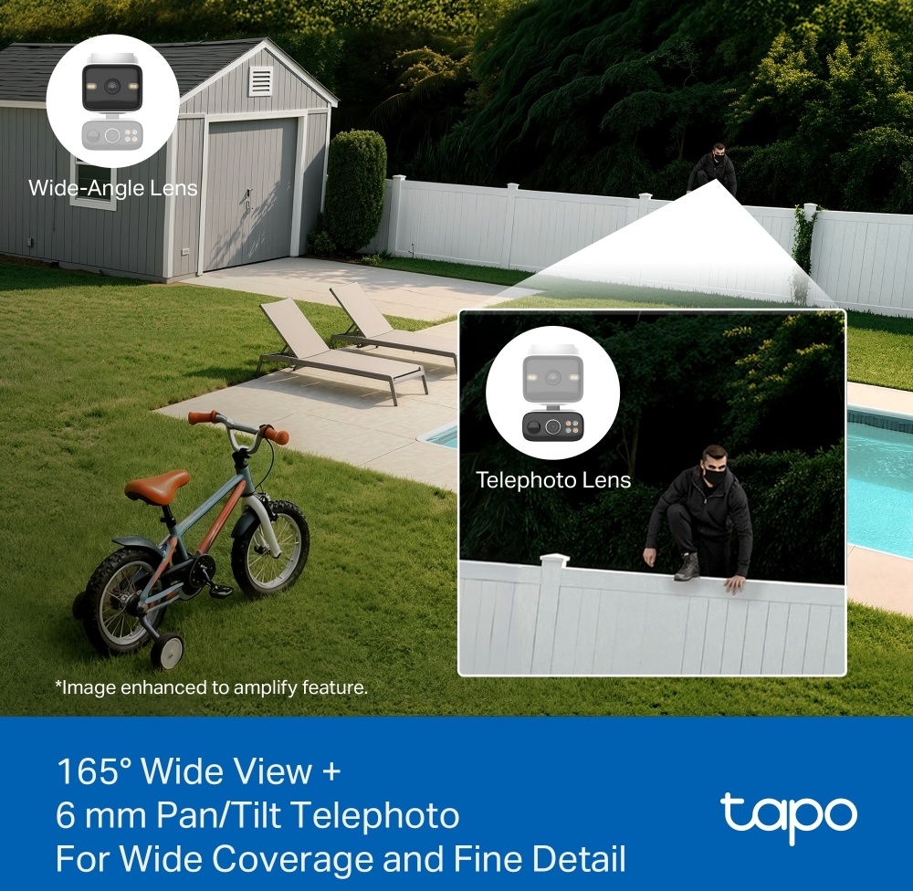 TP-Link Tapo C645D KIT — це сучасна камера відеоспостереження з двома об’єктивами 2K та сонячною панеллю, яка забезпечує широке та детальне покриття території без потреби в постійному підключенні до мережі. Фіксований надширококутний об’єктив з кутом огляду 165° охоплює велику зону, а телеоб’єктив з функцією панорамування та нахилу дозволяє точно наближати та відстежувати об’єкти. Завдяки незалежному керуванню об’єктивами ви можете одночасно спостерігати за двома різними зонами: ширококутний об’єктив фіксує загальну картину, а рухомий — забезпечує 360° горизонтальне покриття для детального перегляду.