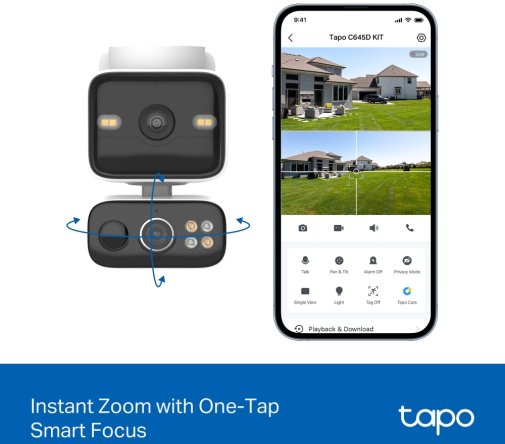 Камера оснащена інтелектуальними функціями виявлення людей, транспортних засобів і домашніх тварин без додаткової передплати. Система мінімізує помилкові сповіщення, а синхронізоване інтелектуальне відстеження дозволяє рухомому об’єктиву автоматично слідкувати за рухом, виявленим фіксованою камерою. Функція фокусування одним дотиком дає змогу миттєво наблизити та центрувати зображення на будь-якій точці ширококутного екрана в реальному часі, забезпечуючи чітке бачення важливих деталей.