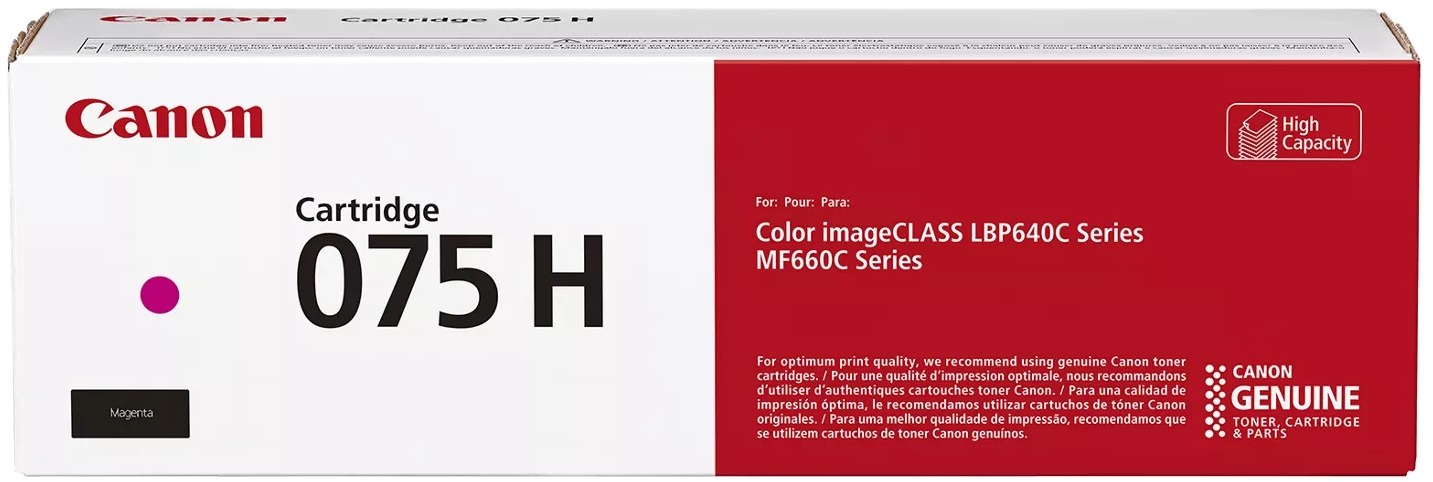 Canon 075H — це оригінальний тонер-картридж підвищеної місткості, розроблений спеціально для лазерних кольорових принтерів і БФП серій Canon imageCLASS LBP640 та MF660. Він сумісний з моделями MF664Cdw, MF667Cdw, LBP646Cdw та LBP647Cdw і є старшою версією у лінійці 075 з вдвічі більшим ресурсом порівняно зі стандартним картриджем.