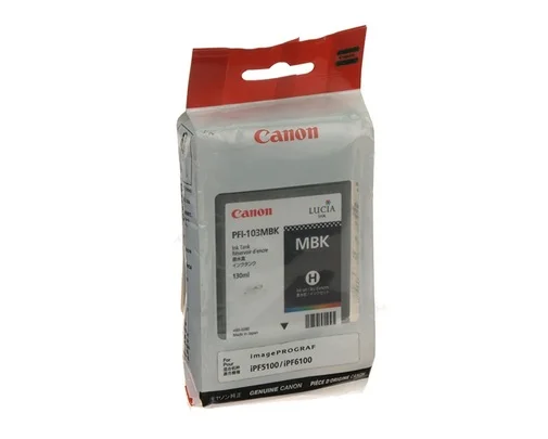 Canon PFI-103 MBk - оригінальний картридж, що розроблявся спеціально для сучасних кольорових струменевих принтерів Canon моделей IPF5100 / 6100. Завдяки використанню новітнього чорнила на основі пігменту, компанії Сanon вдалося досягнути вражаючої роздільної якості, економії друку та глибини матового чорного кольору. При використанні разом з іншими картриджами, Canon PFI-103 MBk дозволить друкувати насичені фотографії, репродукції, плакати та інші документи. Картридж легко встановлюється, та в подальшому не потребує додаткового технічного обслуговування. А відбитки отримані з допомогою Canon PFI-103 MBk зберігатимуть свій вигляд дуже довгий час.