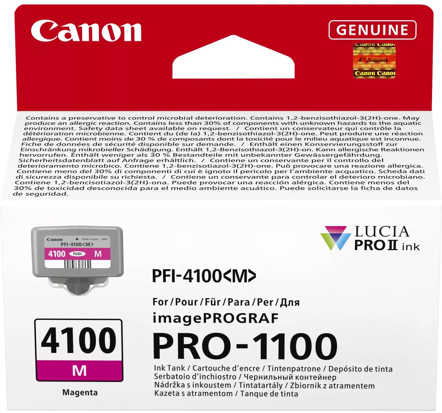 Картридж Canon PFI-4100 — це оригінальний пігментний чорнильний контейнер для професійних фотопринтерів серії imagePROGRAF PRO-1100, призначений для високоякісного друку з акцентом на точне відтворення малинових відтінків, глибинну насиченість і стійкість до вицвітання, перетворюючи звичайні зображення на галерейного рівня твори, ніби невидимий помічник, що підкреслює кожен нюанс у фотографіях чи графічних проєктах.