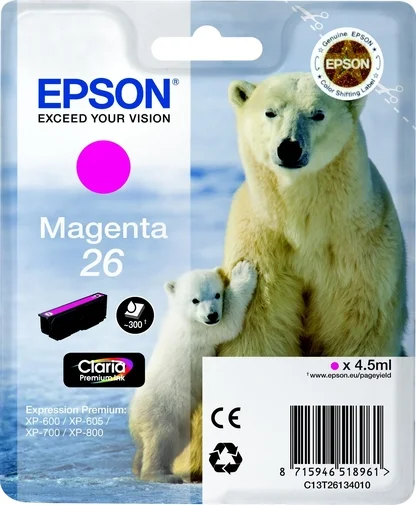 Epson C13T26134010 - оригінальний картридж об'ємом 4.5 мл, що наповнений водорозчинним рожевим чорнилом Epson Claria. Це висококласне чорнило запезпечить відтворення всієї палітри кольорів, стійкість до вицвітання та розмазування. Картридж розроблений за новітніми технологіями спеціально для використання зі струменевими принтерами Epson XP600 / 605 / 700. Epson C13T26134010 - відмінний вибір сучасного оригінального картриджа, що довготривалим терміном служби повністю виправдяє витрачені на нього кошти.